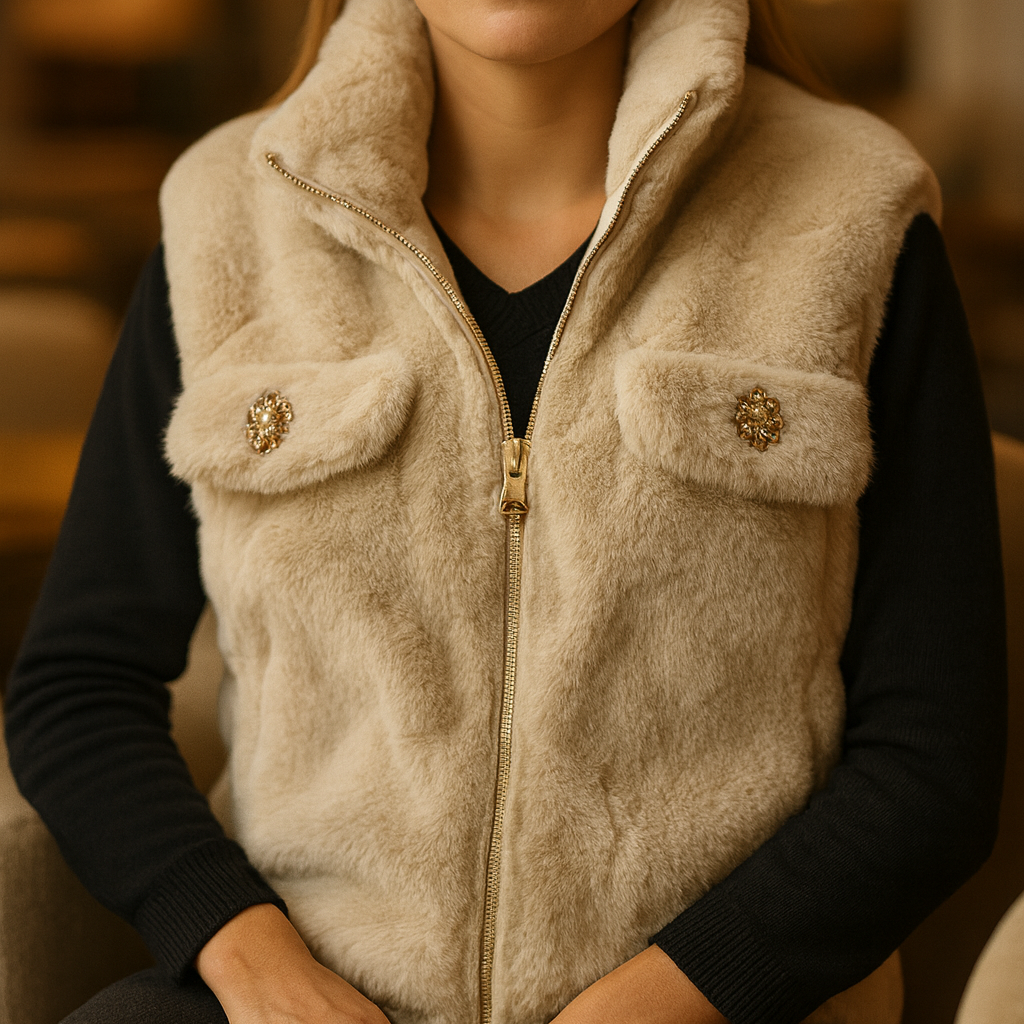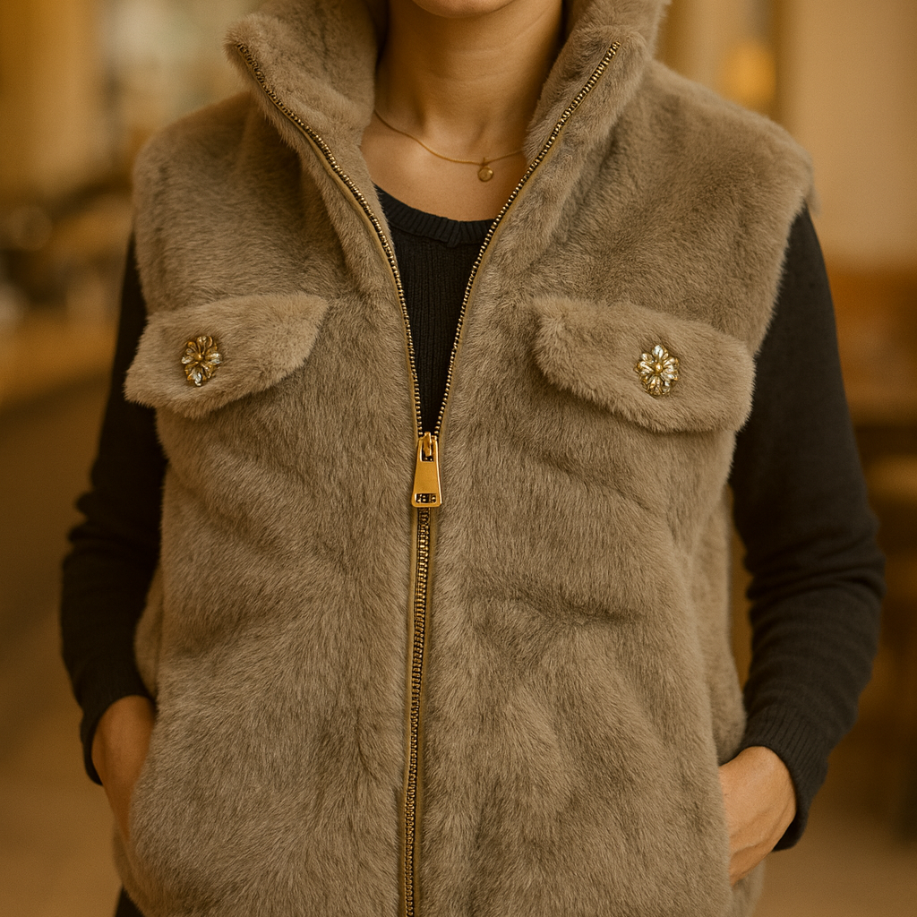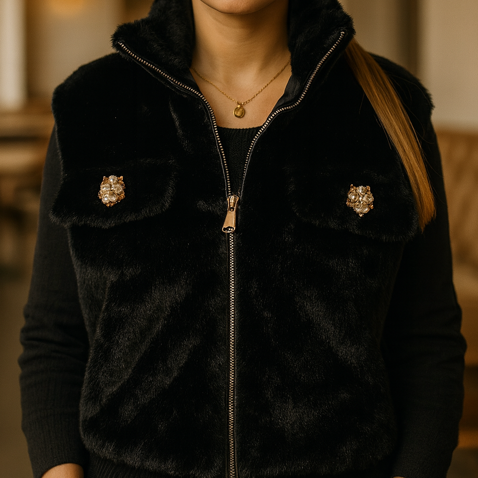 - Descripción: El chaleco SIBERIA combina elegancia y calidez en una sola prenda. Su textura ultrasuave y el acabado de efecto pelo aportan un toque de lujo a cualquier look. Disponible en negro, marrón y beige, se convierte en ese imprescindible de entretiempo que eleva cualquier outfit, desde unos jeans hasta un vestido. Cierre dorado y botones joya que reflejan la esencia sofisticada de Alma de Plata.✨