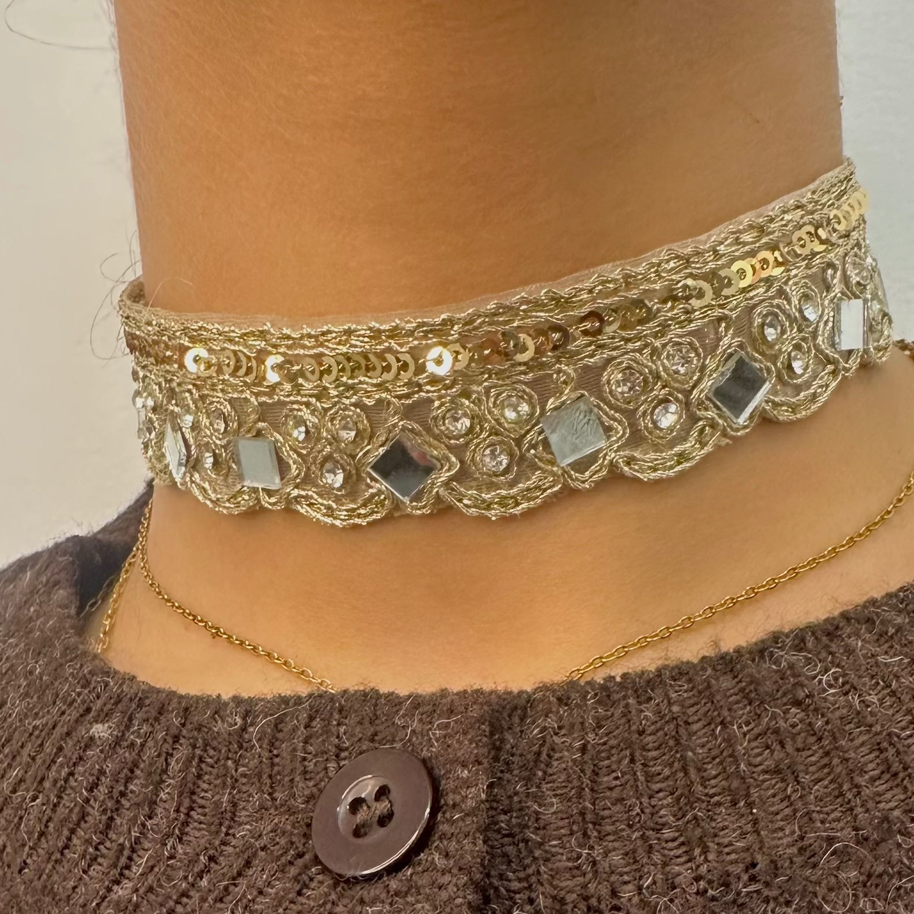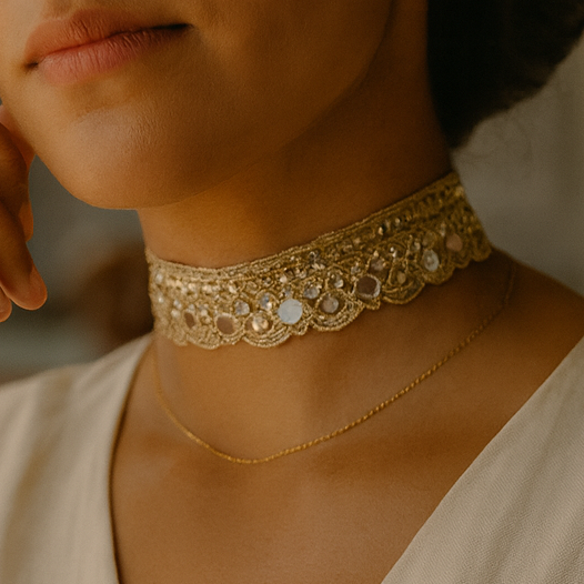 - Descripción: Satori es un chocker dorado que combina luz y armonía en cada detalle, elevando el look con un brillo sereno y elegante. Una pieza diseñada para mujeres que buscan ese toque de claridad y presencia que transforma cualquier momento.