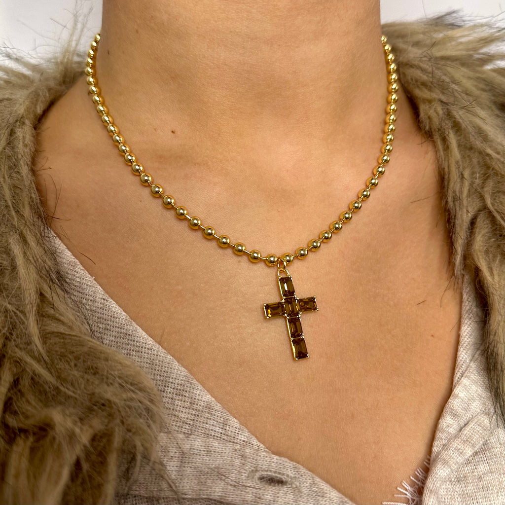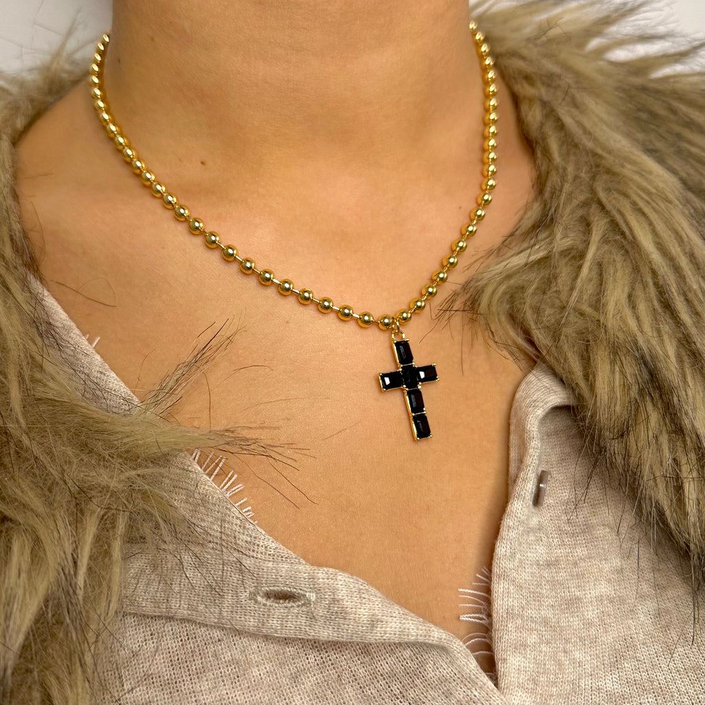 - Descripción: El Collar Liora destaca por su cadena de esferas doradas y su cruz de cristales tallados que reflejan la luz con un brillo elegante y sereno. Una pieza delicada y luminosa que aporta un toque atemporal a cualquier look. Ideal para mujeres que buscan bisutería fina, versátil y con presencia.✨
