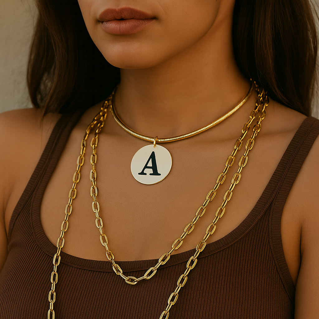 - Descripción: Chocker en baño de oro con medalla redonda y letra personalizada al centro, perfecto para llevar tu esencia siempre contigo. Una pieza moderna y sofisticada que combina minimalismo con un toque único de identidad.