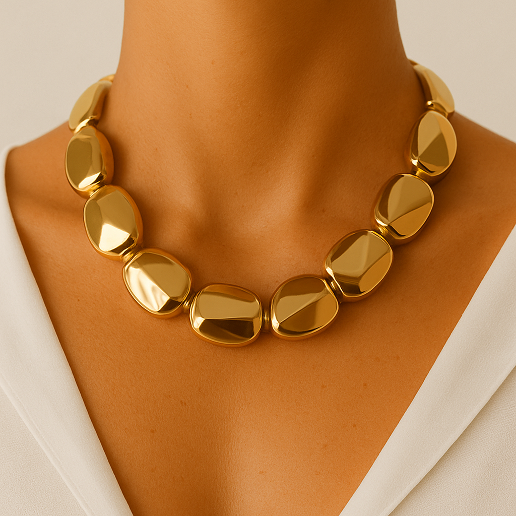 Collar de eslabones dorados pulidos con un diseño escultural y poderoso. Su estilo elegante y atemporal eleva cualquier look con un toque de lujo majestuoso. ✨
