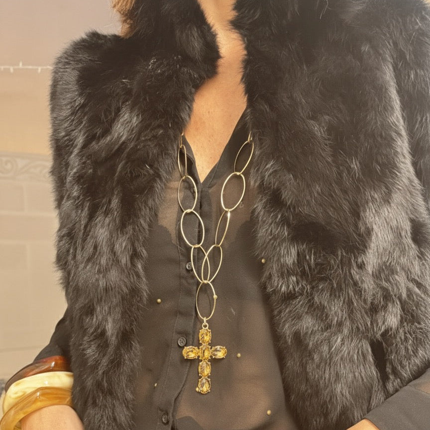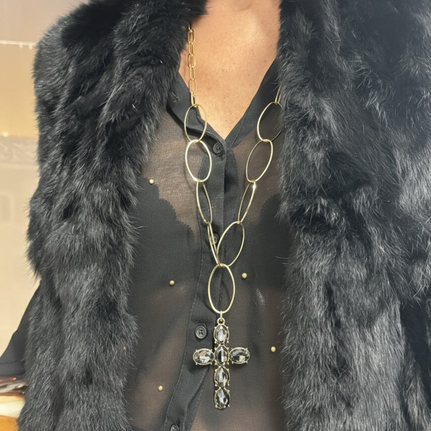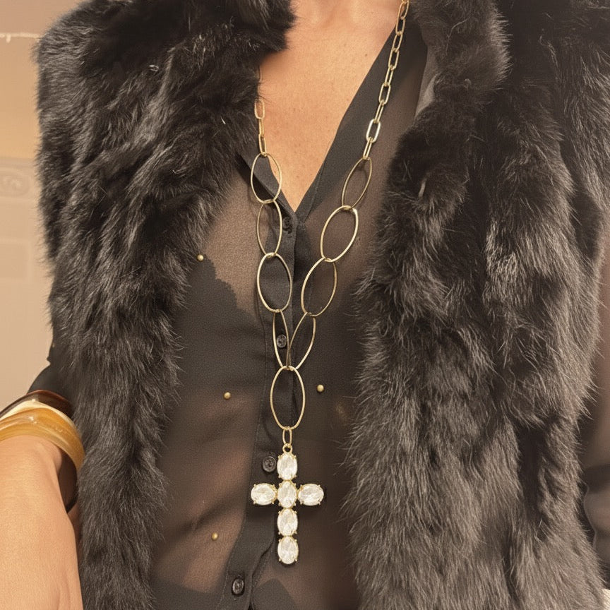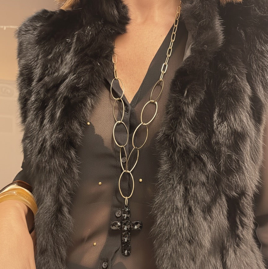 Descripción: El collar Sacra combina la fuerza del dorado con la elegancia de una cruz central que simboliza protección y poder interior.