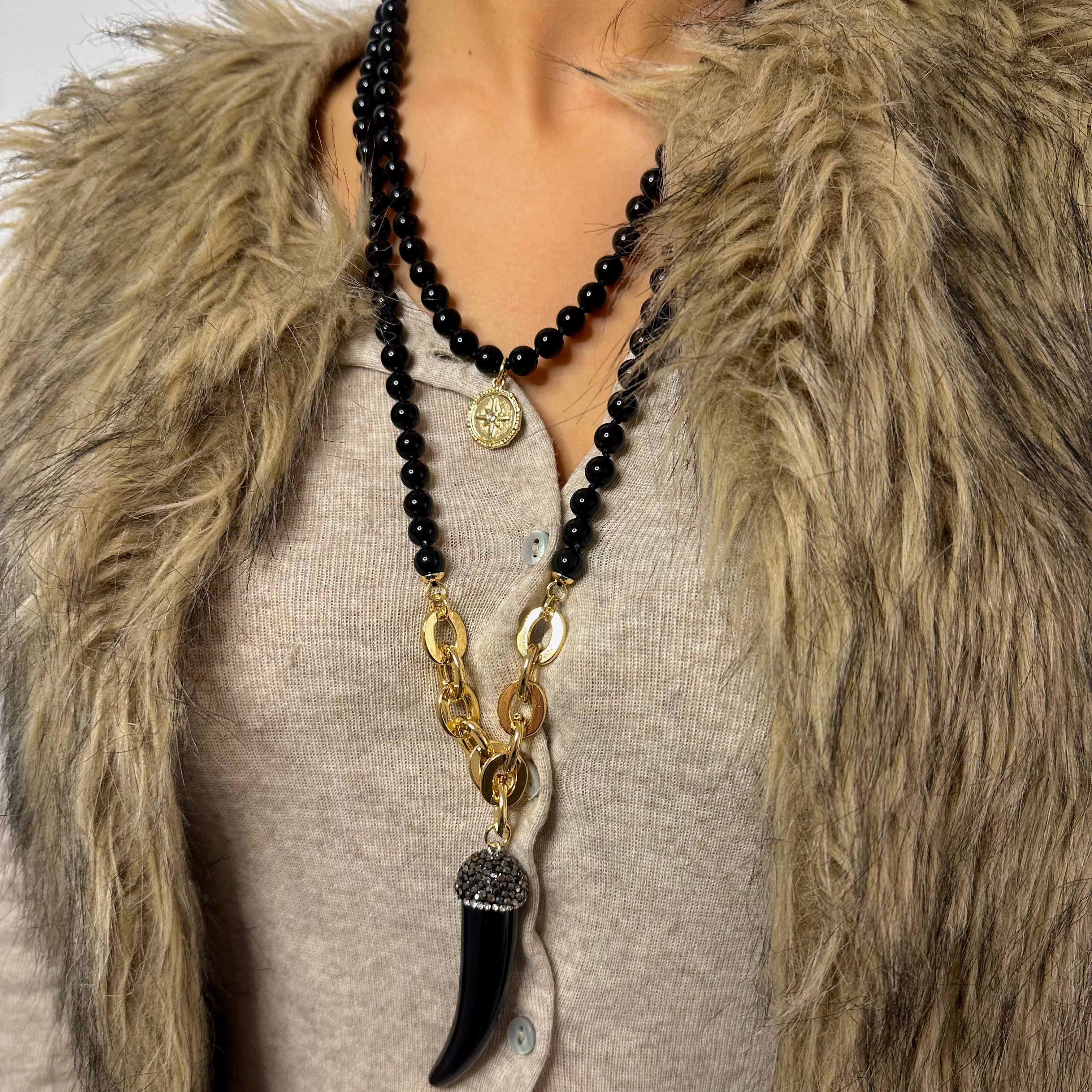 - Descripción: El Collar Karu destaca por su cadena de cuentas negras pulidas combinada con eslabones dorados y un imponente colgante en forma de cuerno engastado en cristales. Una pieza poderosa y sofisticada que aporta carácter, estilo y un magnetismo único a cualquier look. Ideal para mujeres que buscan bisutería original, con presencia y un toque de luz en cada detalle.✨