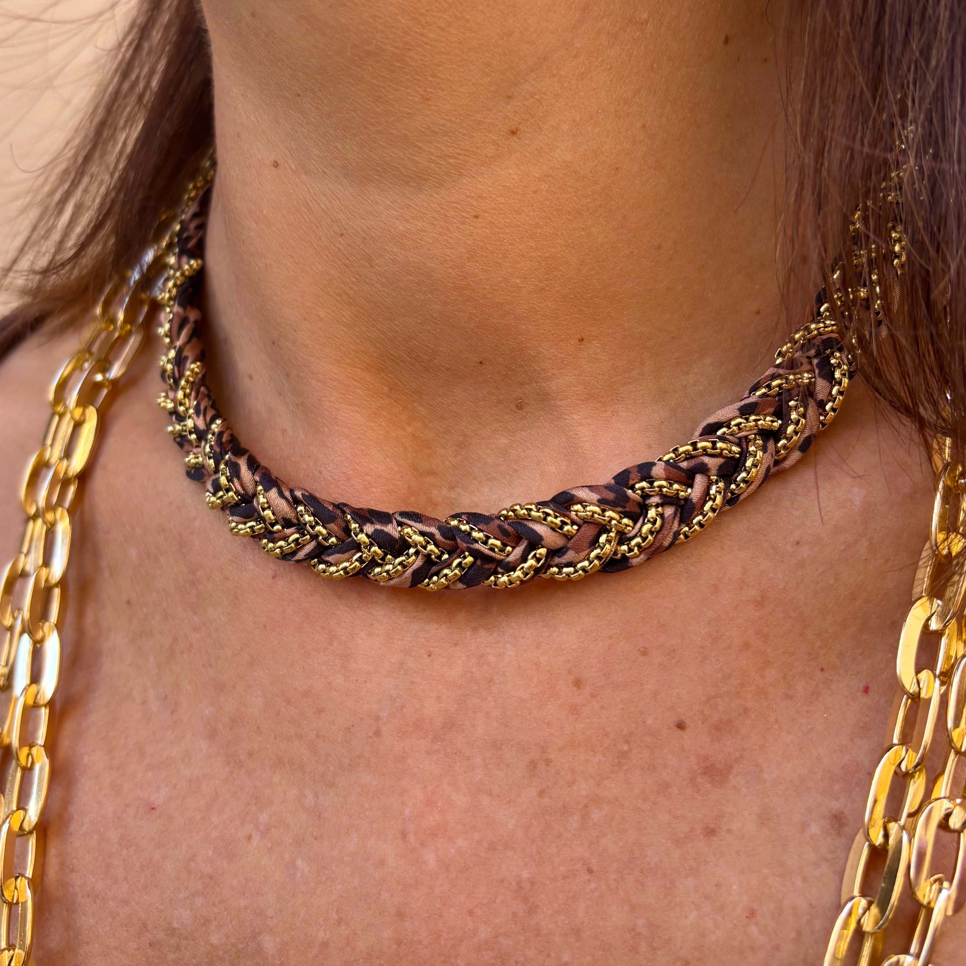 Choker trenzado con detalles dorados que envuelven el cuello con fuerza y estilo. Una joya atrevida y sofisticada que transforma cualquier look en una declaración de personalidad.