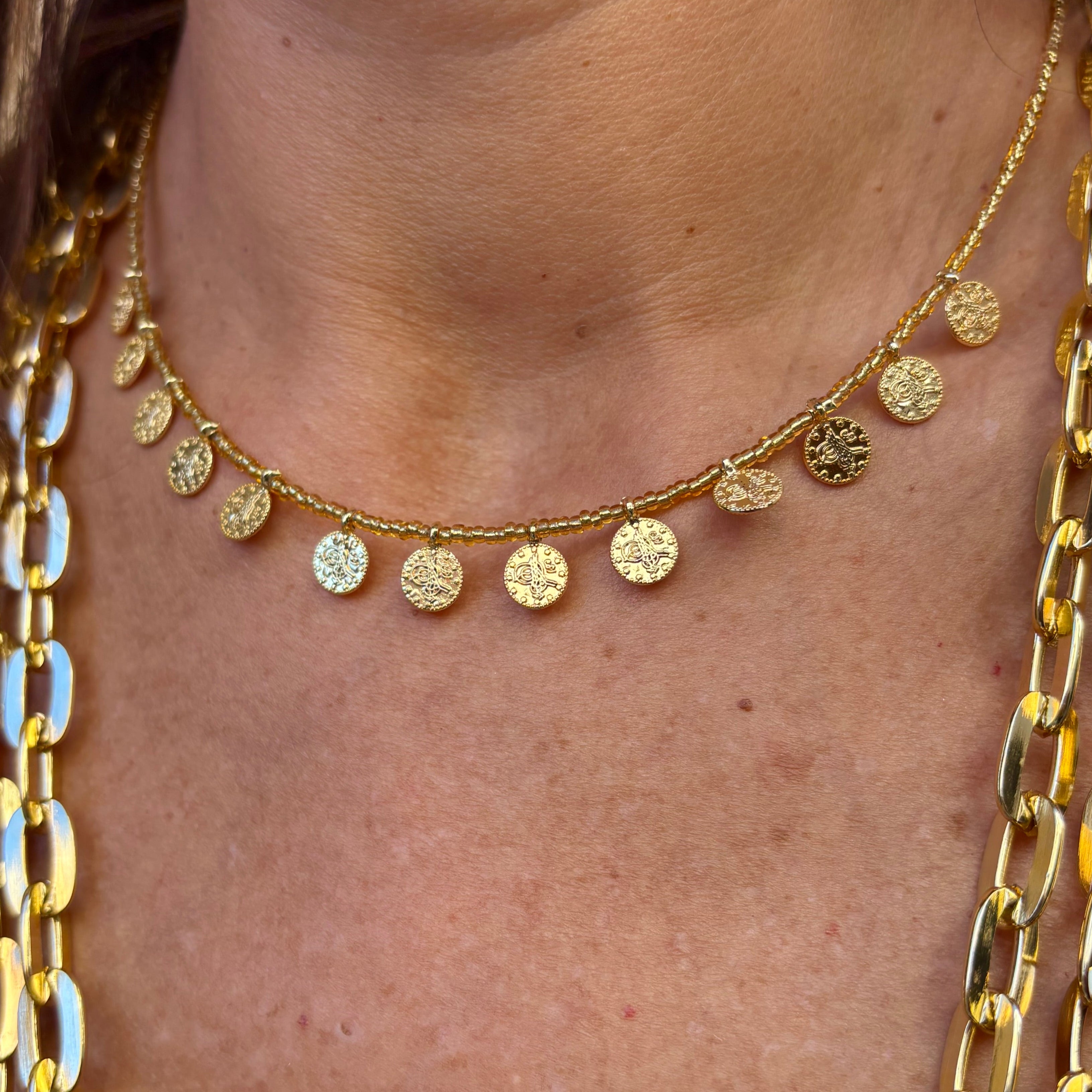 - Descripción: Collar tipo gargantilla en baño de oro, decorado con dijes circulares que evocan el brillo del sol y la delicadeza de la luna. Una pieza versátil que aporta elegancia y un toque bohemio a cualquier look.