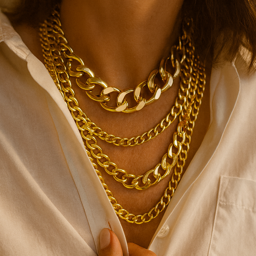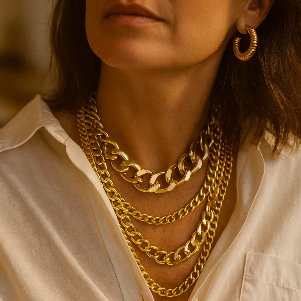 - Descripción: El collar Valentia es una declaración de poder y estilo. Su composición de múltiples cadenas doradas de distintos grosores crea una armonía audaz y sofisticada. Perfecto para mujeres que no temen destacar, esta pieza transforma cualquier look clásico en uno lleno de carácter y presencia. Ideal para llevar solo o combinar con otros accesorios dorados.✨