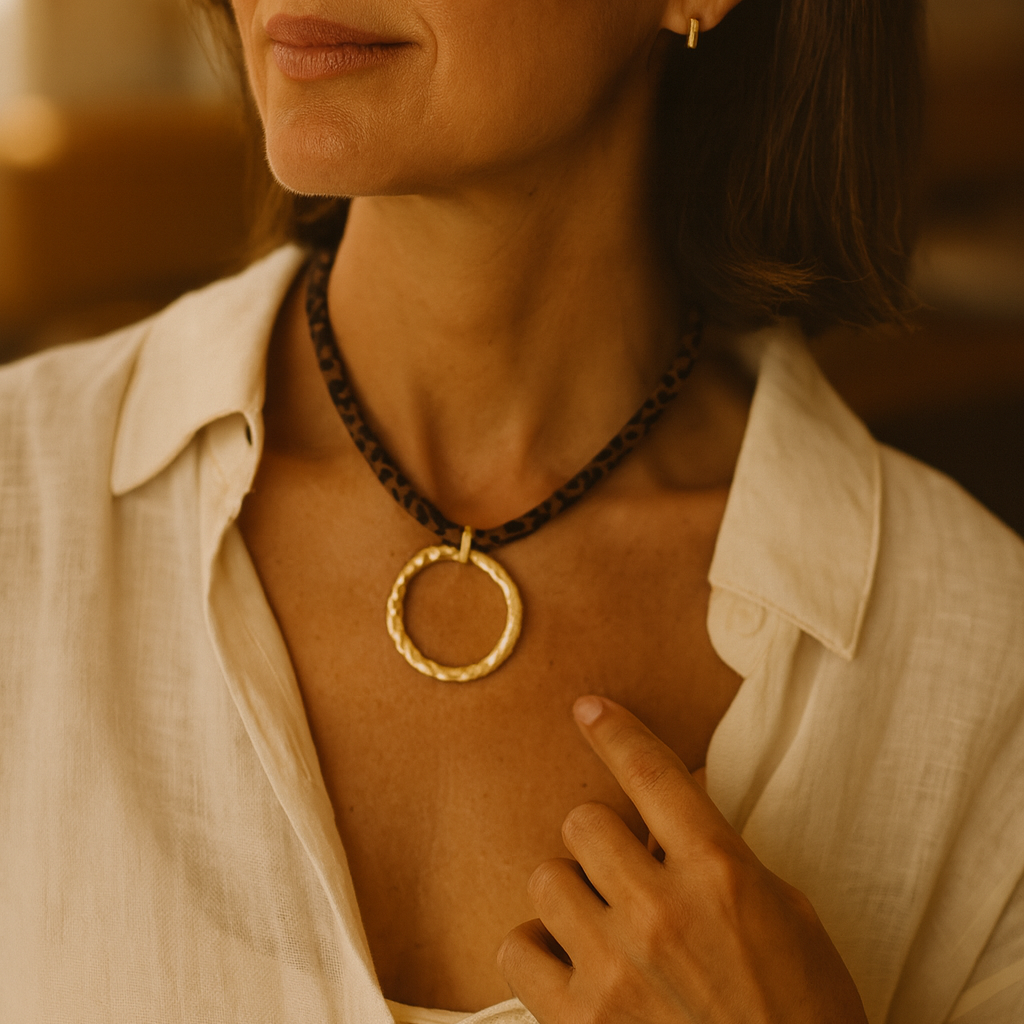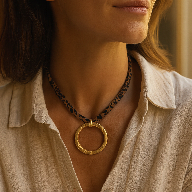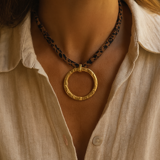 El collar SAVANNA combina la fuerza del estampado animal print con la elegancia del colgante circular en dorado martelé, símbolo de plenitud. Una pieza con carácter que aporta un aire salvaje y sofisticado, ideal para marcar tu propio estilo.