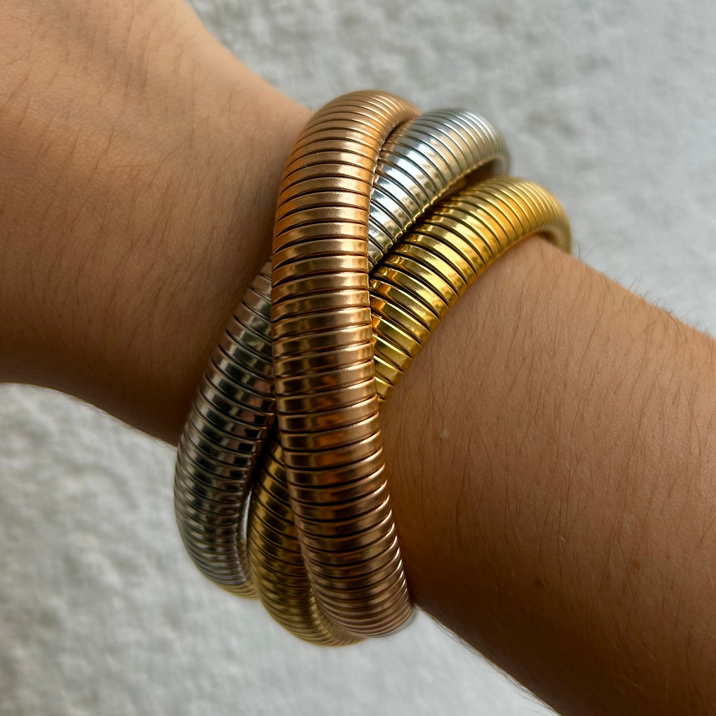 - Material: Pulsera tubular de acero en tonos dorado, plateado y cobrizo con acabado elástico y flexible.
