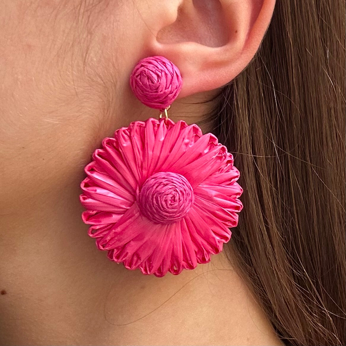 - Material: Pendientes elaborados con fibras sintéticas trenzadas en tono fucsia intenso, con estructura circular ligera.