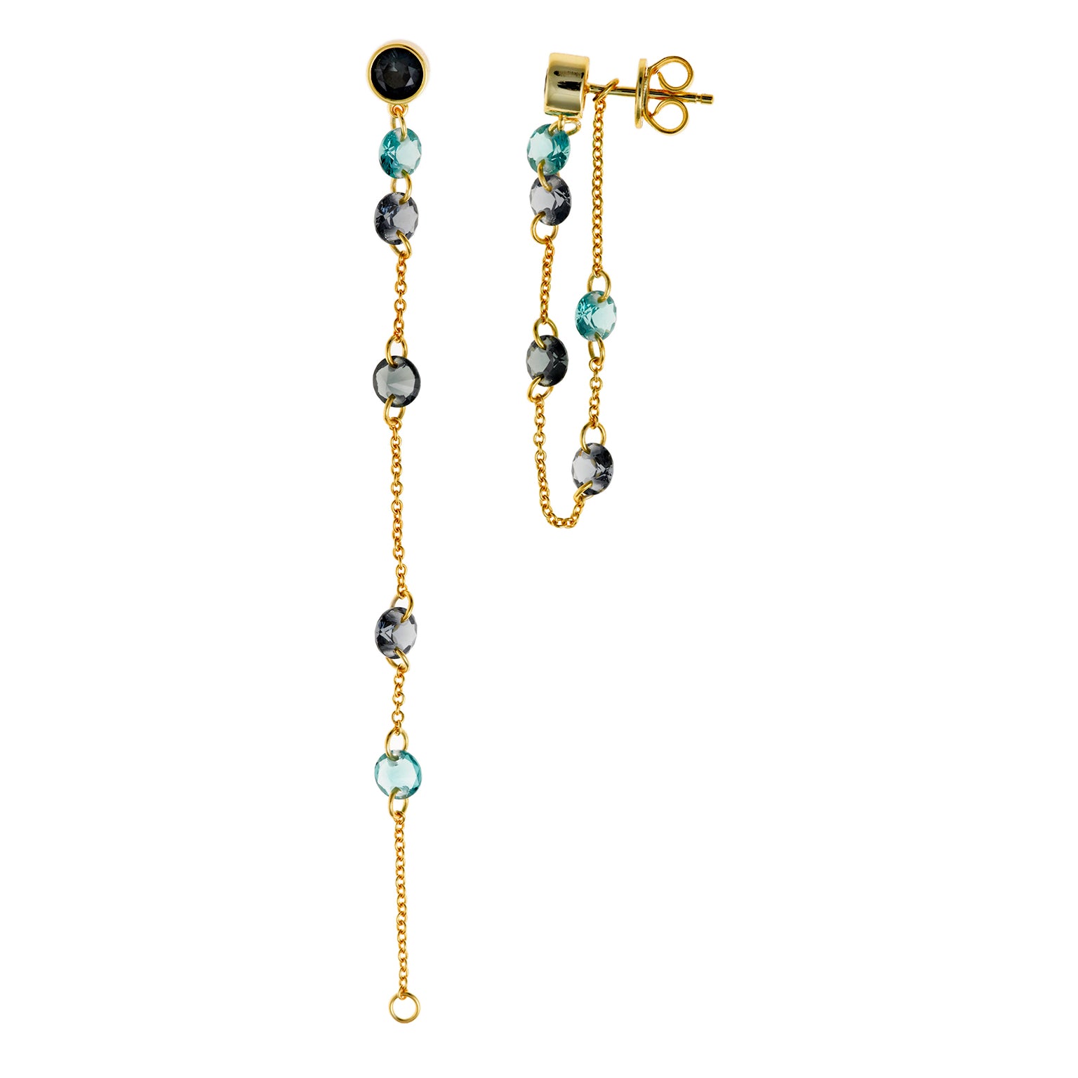 - Descripción: Los pendientes AVELIA son delicados y combinan los tonos verdes y azulados para resaltar al máximo la belleza natural de quien los lleva. Se pueden poner en dos posiciones, largos o con cadena recogida.