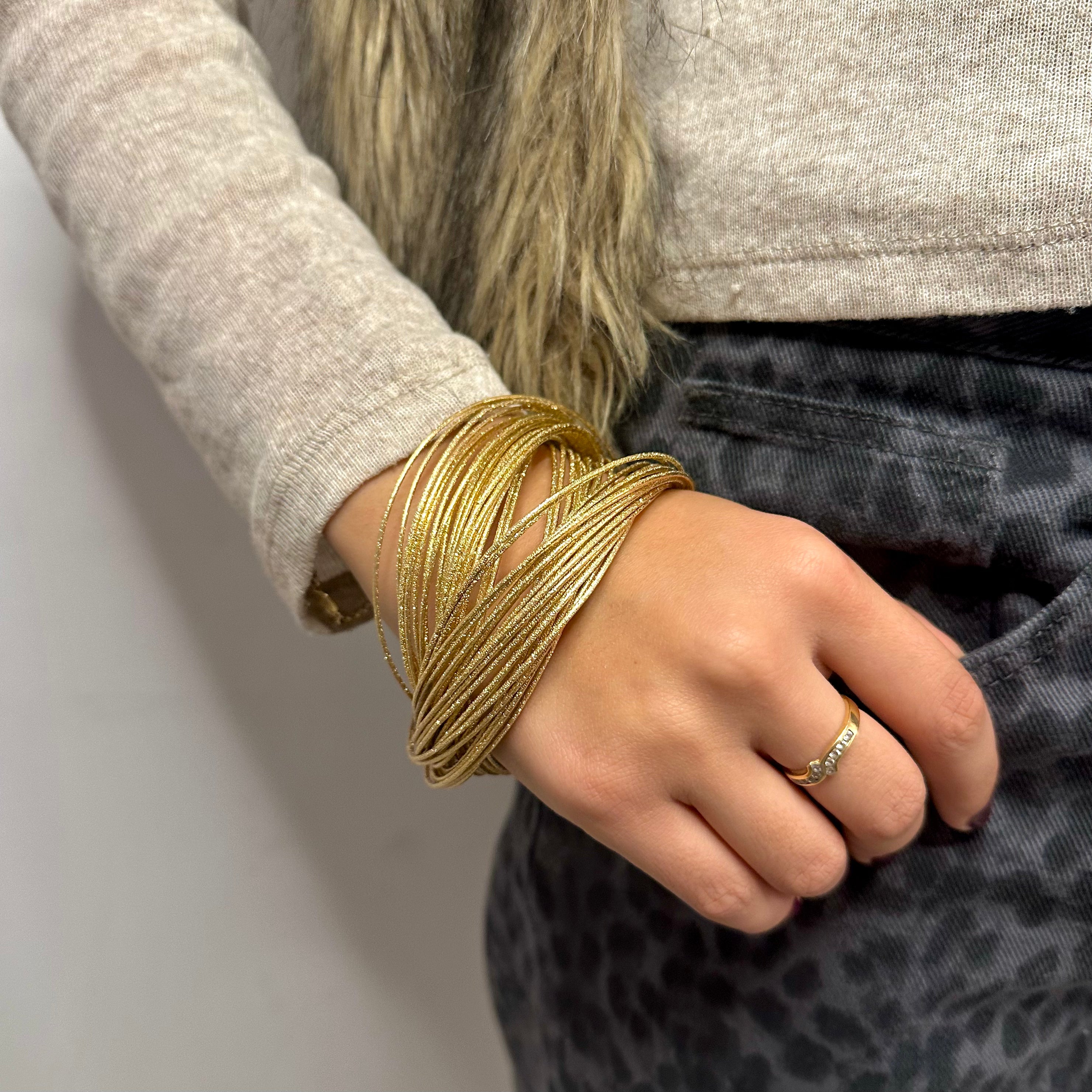 - Descripción: El Brazalete Isara está formado por múltiples hilos dorados que se entrelazan creando un efecto envolvente, ligero y espectacular. Su diseño flexible y brillante aporta movimiento, textura y un toque sofisticado a cualquier look. Una pieza de bisutería premium, versátil y luminosa, ideal para mujeres que buscan estilo con carácter.✨
