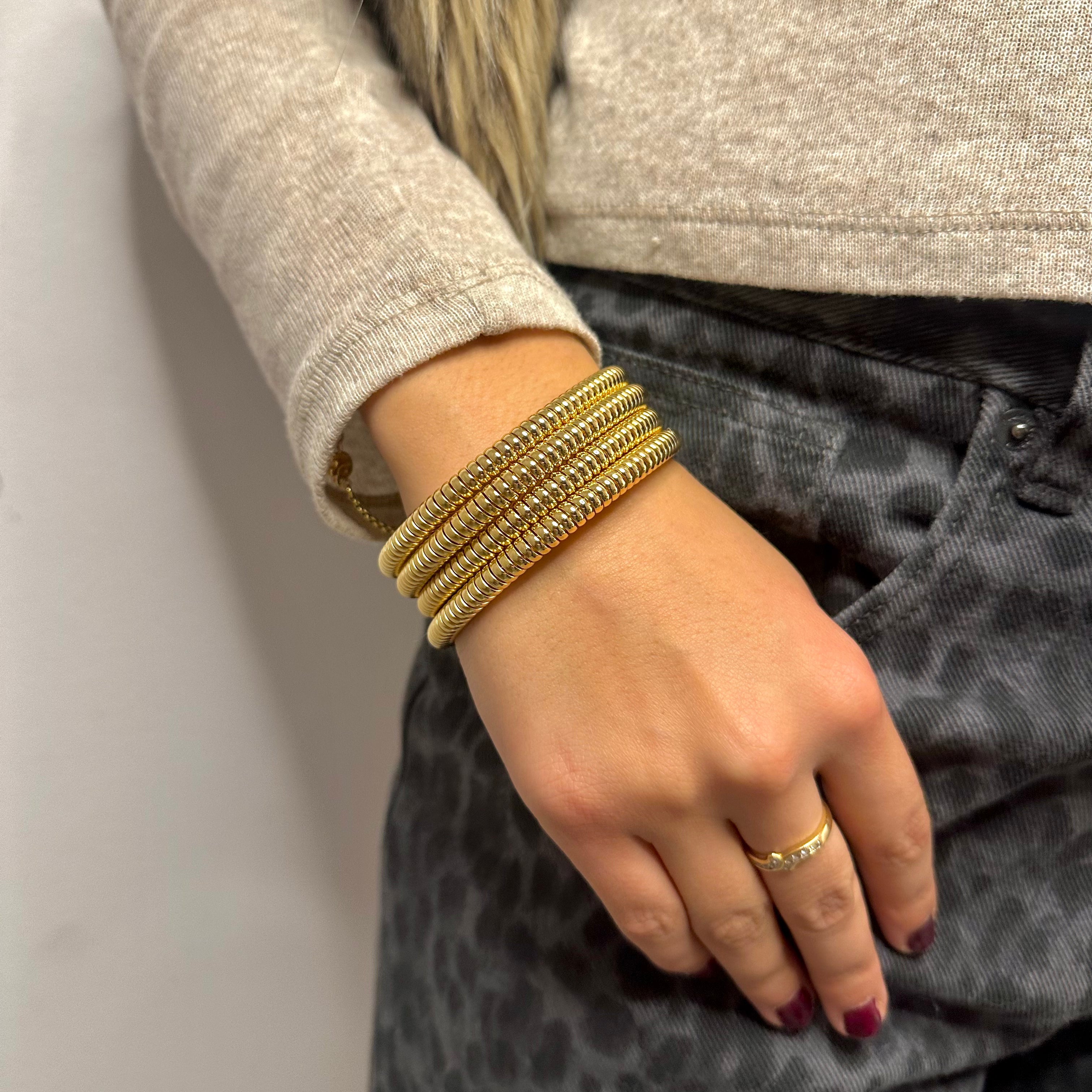 La Pulsera Lux combina varias vueltas tubulares doradas con un acabado brillante que aporta luz y sofisticación a la muñeca. Su diseño flexible y envolvente crea un efecto moderno y elegante, perfecto para elevar cualquier look con un toque de estilo refinado. ✨
