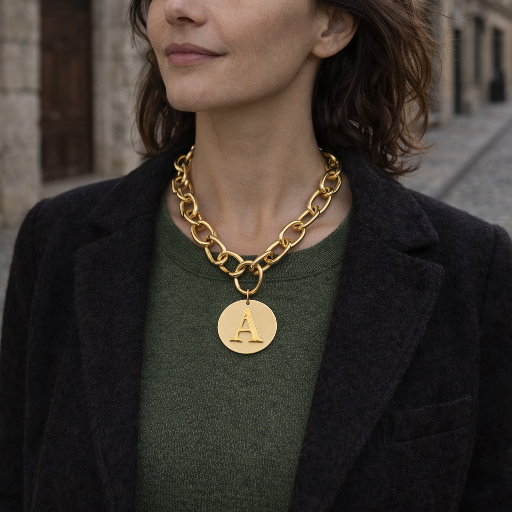 Collar con inicial dorado para mujer, fabricado con cadena de eslabones ligeros y colgante circular grabado con letra personalizada. Una joya práctica y cómoda, pensada para el uso diario y para combinar con otros collares.