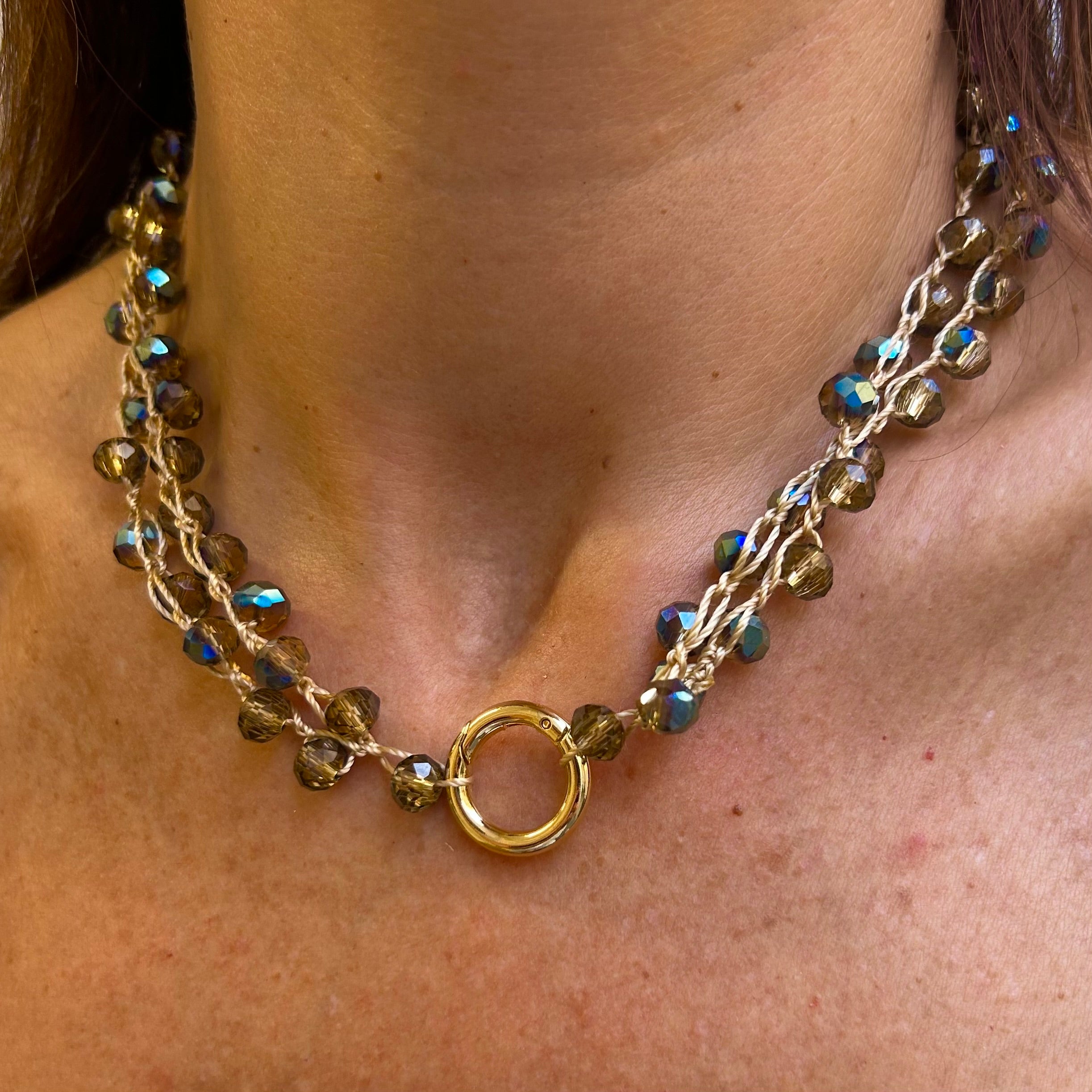 Nexo es una pieza que simboliza conexión y equilibrio. Su diseño combina la delicadeza de los cristales con la fuerza del aro dorado, creando un contraste elegante y moderno. Un accesorio versátil que ilumina cualquier look con un toque artesanal y contemporáneo.