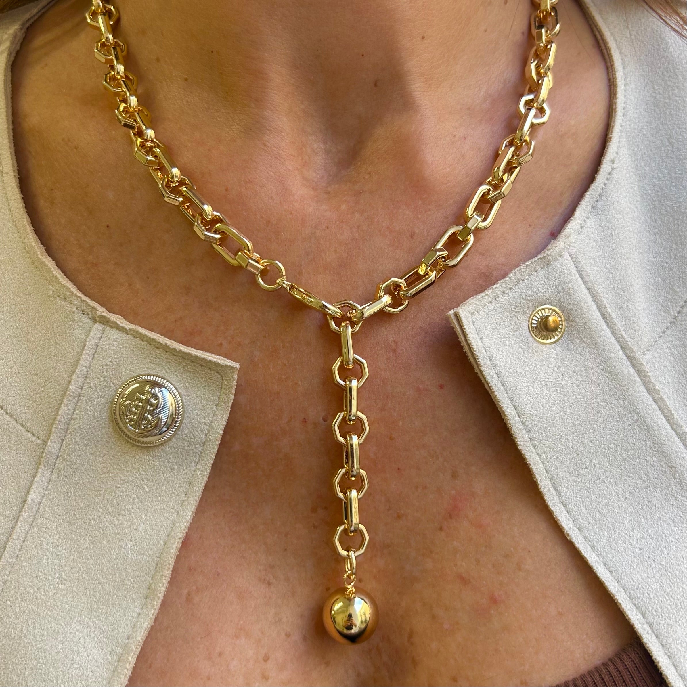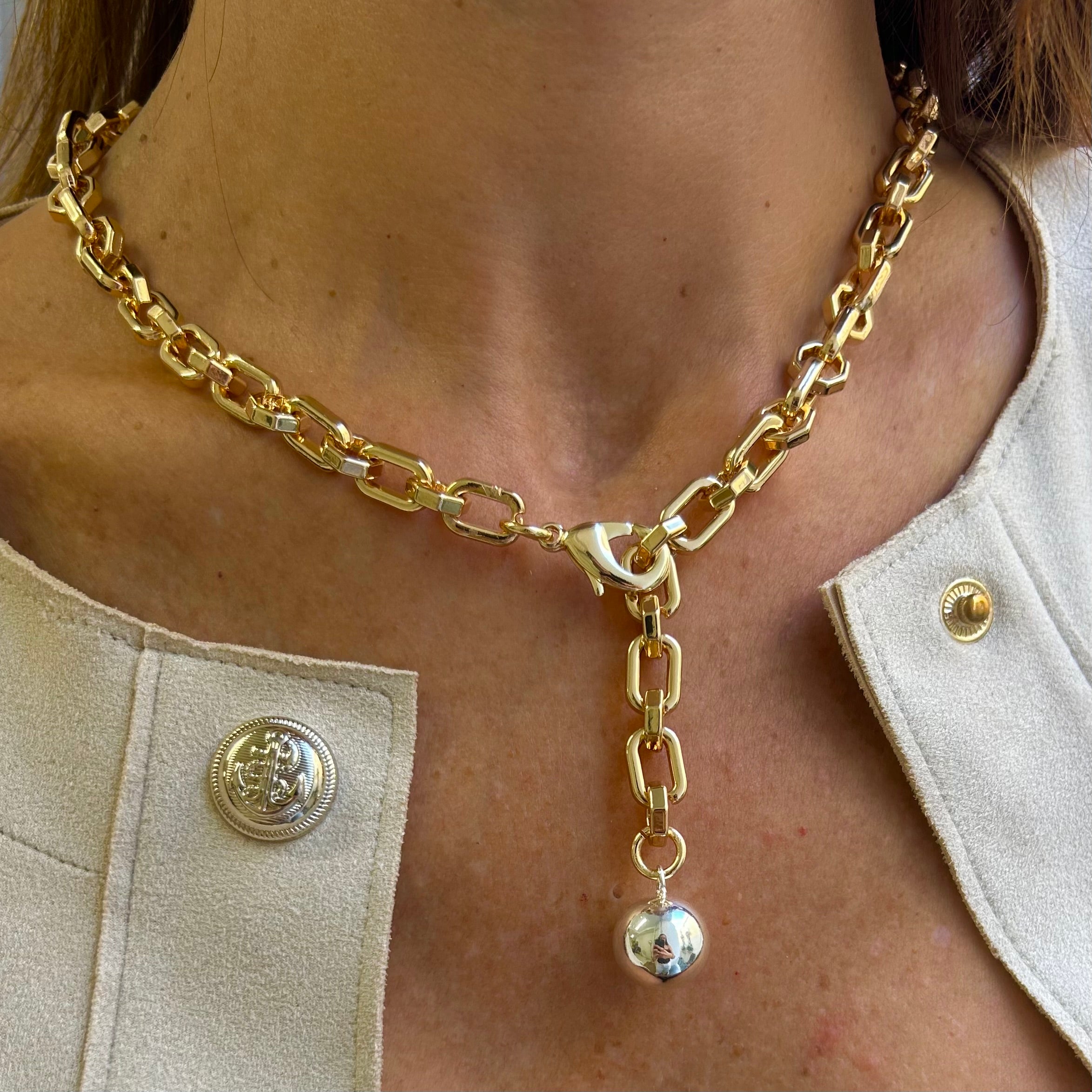 • Descripción: este collar irradia elegancia y poder con un diseño que combina modernidad y distinción. La cadena de eslabones gruesos aporta presencia y estilo, mientras la esfera central refleja la luz con un brillo sofisticado. Una pieza versátil y contemporánea que realza cualquier look con un toque de fuerza y glamour. ✨